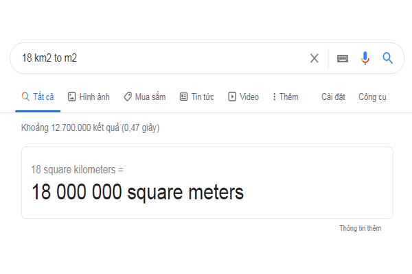 Ví dụ: Bạn cần quy đổi 18 km2 sang m2, bạn chỉ cần vào google tìm kiếm với từ khóa ” 18 km2 to m2″, bạn sẽ có kế quả chính xác ngay lập tức.